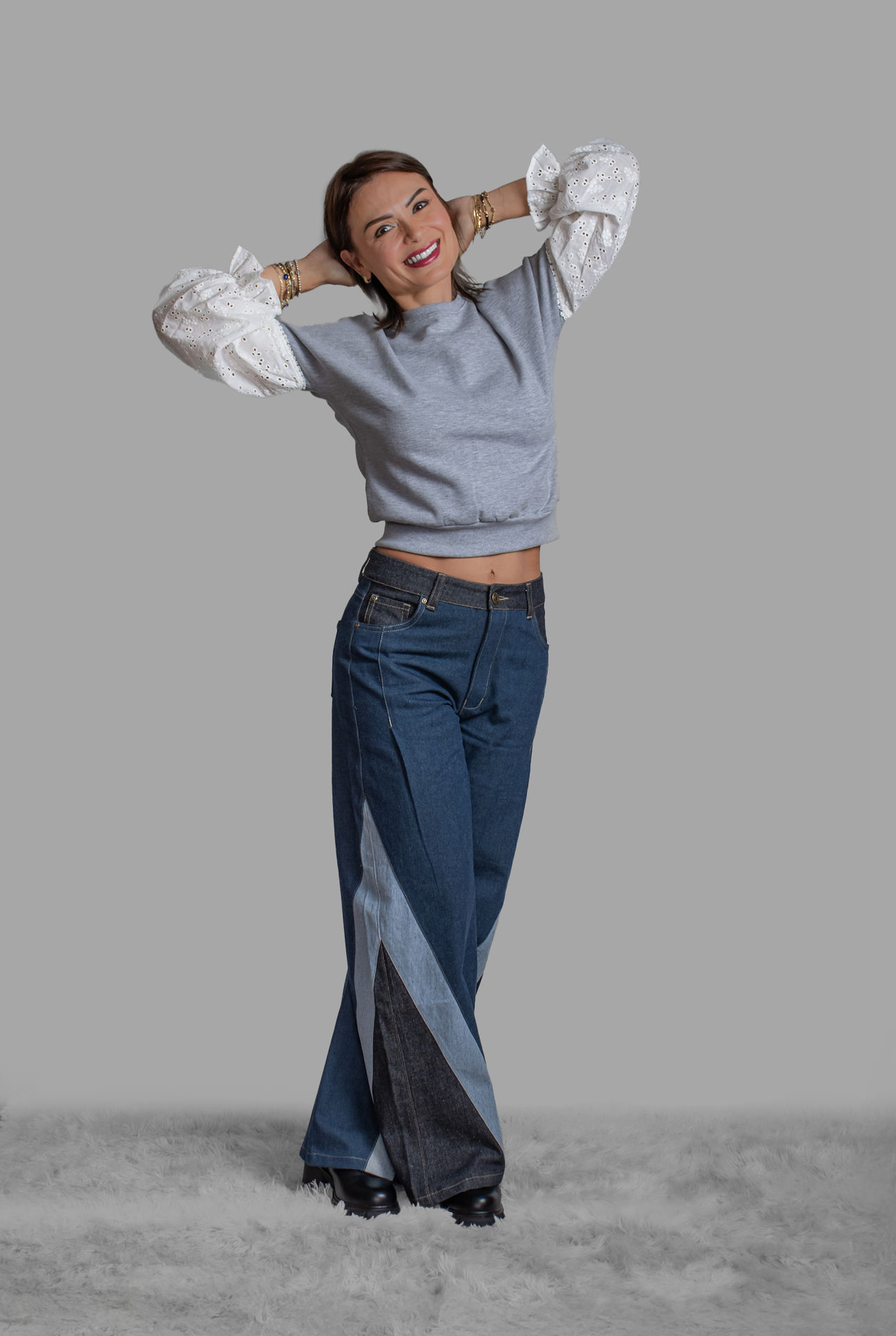 Pantalón jean de mezclilla con diseño palazzo de pierna ultra ancha y tiro alto, confeccionado con una innovadora técnica de patchwork que combina diferentes tonos de denim en azul oscuro, azul medio y azul claro creando un efecto degradé único. Presenta cintura ajustada con cierre frontal, bolsillos clásicos de cinco bolsillos y costuras contrastantes que resaltan el diseño de paneles. Su corte holgado y fluido desde la cadera hacia abajo crea una silueta moderna y cómoda, perfecta para un look casual-chic contemporáneo que combina la comodidad del denim con un toque artístico y vanguardista.